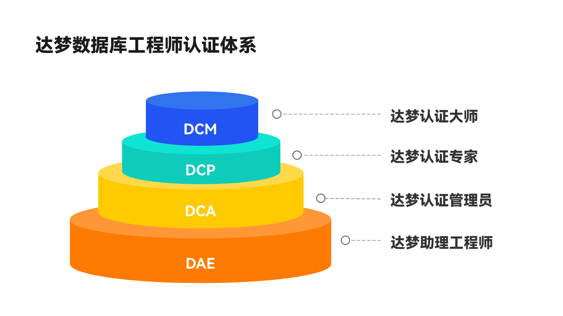根據(jù)技術(shù)深入程度,達(dá)夢(mèng)數(shù)據(jù)庫工程師認(rèn)證體系分為DAE/DCA/DCP/DCM四個(gè)級(jí)別,技術(shù)難度逐級(jí)提升,內(nèi)容涵蓋達(dá)夢(mèng)數(shù)據(jù)庫崗位所需的各項(xiàng)知識(shí)點(diǎn)。