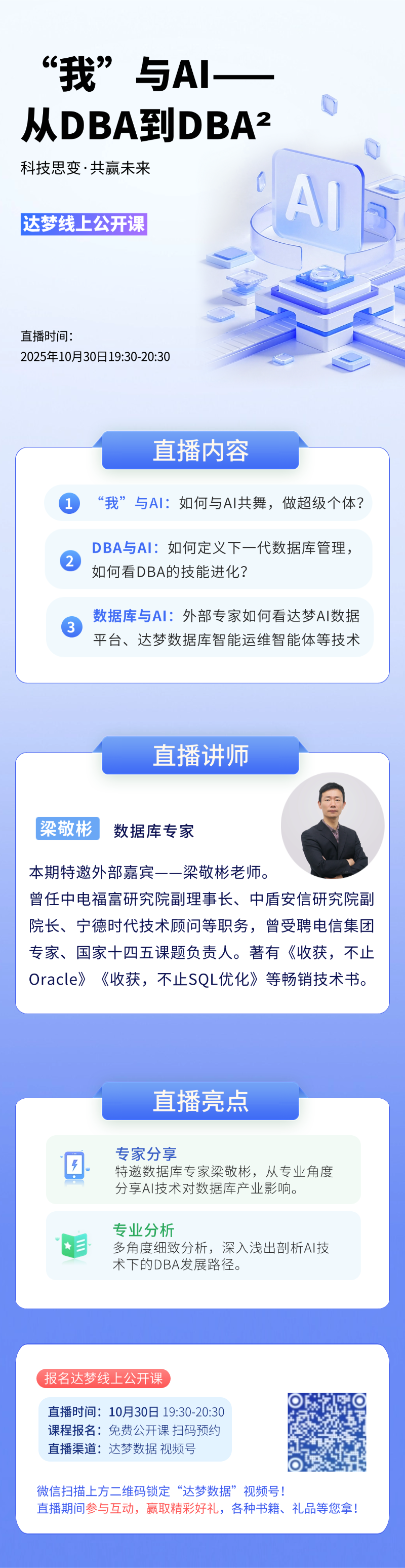 本期公開課《我與AI——從DBA到DBA²》邀請外部專家梁敬彬老師進行分享,主題緊扣AI技術與數(shù)據(jù)庫管理的深度融合,為DBA職業(yè)發(fā)展提供了前瞻性視角。