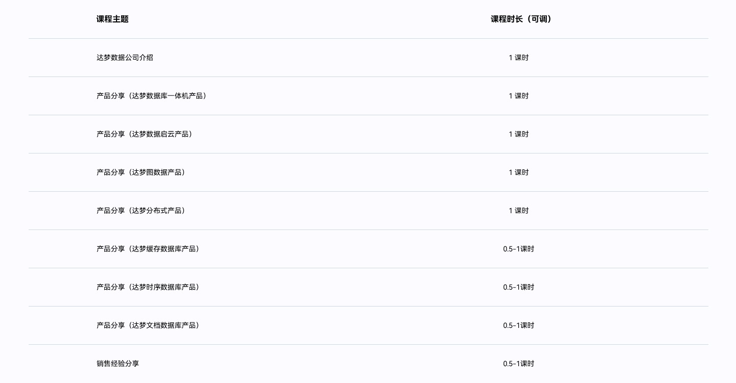 課程內(nèi)容涵蓋數(shù)據(jù)庫發(fā)展簡史及達(dá)夢數(shù)據(jù)公司介紹、達(dá)夢數(shù)據(jù)全棧產(chǎn)品介紹、銷售經(jīng)驗(yàn)分享等。