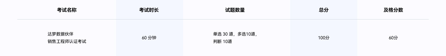 合作伙伴參加達(dá)夢數(shù)據(jù)的賦能并完成考試后,合格者可獲得由達(dá)夢數(shù)據(jù)頒發(fā)的合作伙伴銷售工程師證書。證書有效期2年,過期后需重新參加培訓(xùn)與考試,考試形式為筆試。